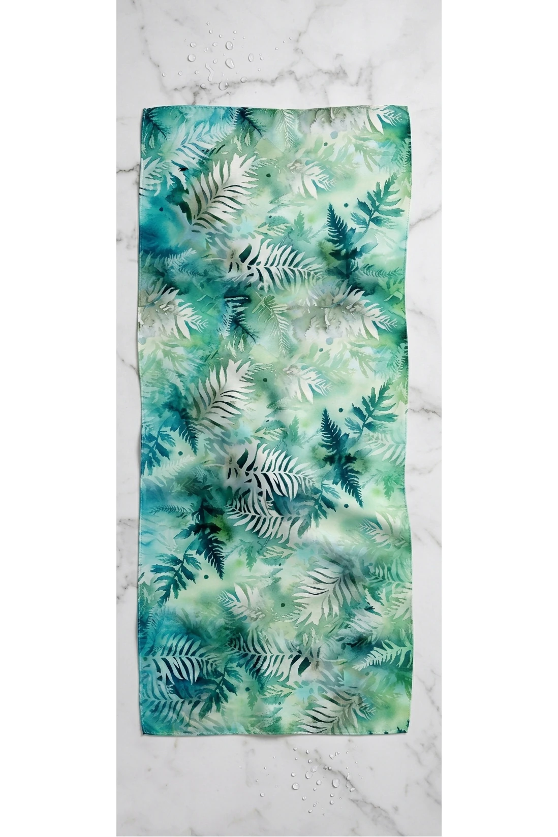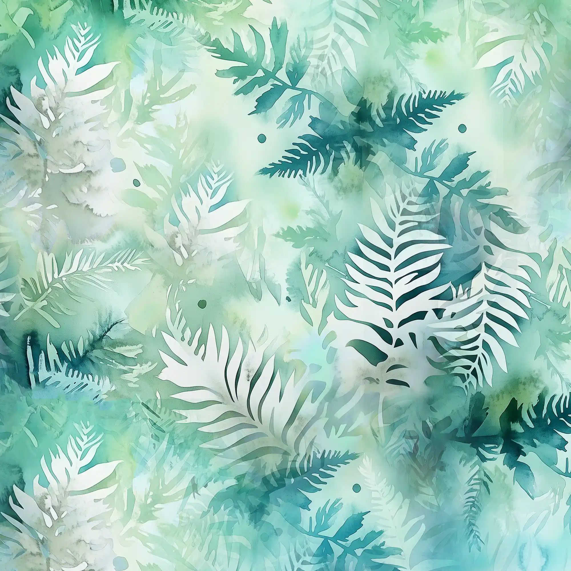 Le motif Lichen Bleu déploie un camaïeu de verts menthe, de turquoise givré et de bleus lagon. Les formes organiques de fougères et de lichens s’entrelacent dans un jeu de transparence propre à l’aquarelle. C’est un dessin qui respire, apportant une luminosité douce et apaisante à votre silhouette.